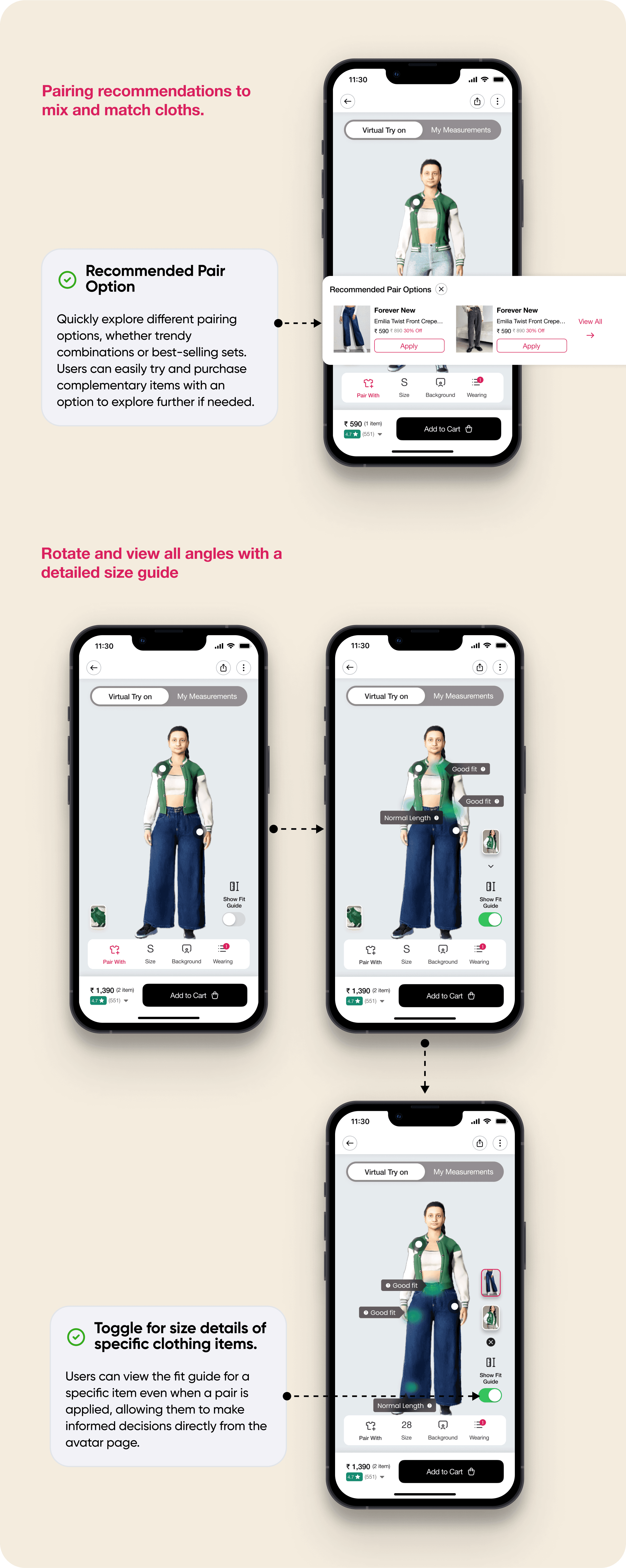 This is where Virtual Try-On comes in. It eliminates second-guessing by allowing users to preview outfits and receive tailored fit recommendations that complement different body types. Regardless of the brand, users no longer need to guess their size—they can see precise fit details, including length, loose or snug fit, and overall suitability.