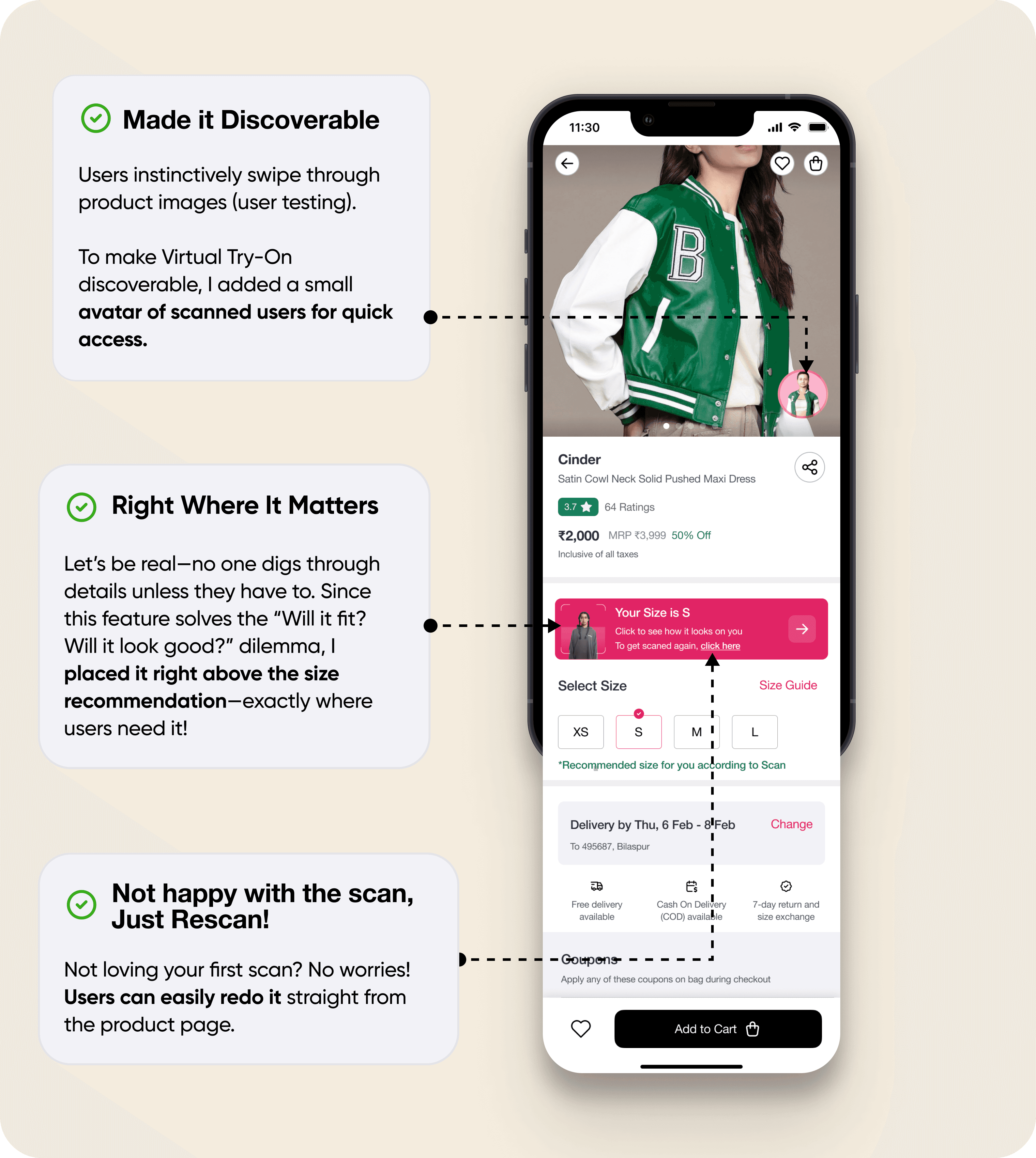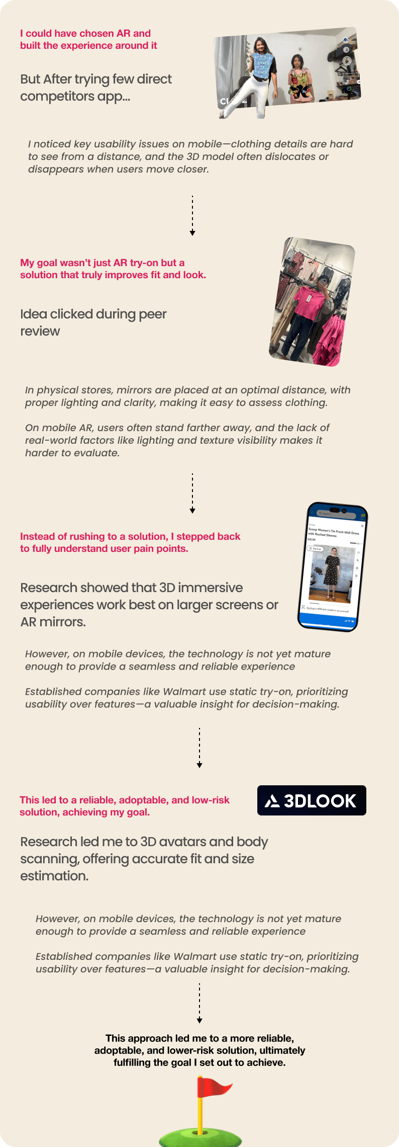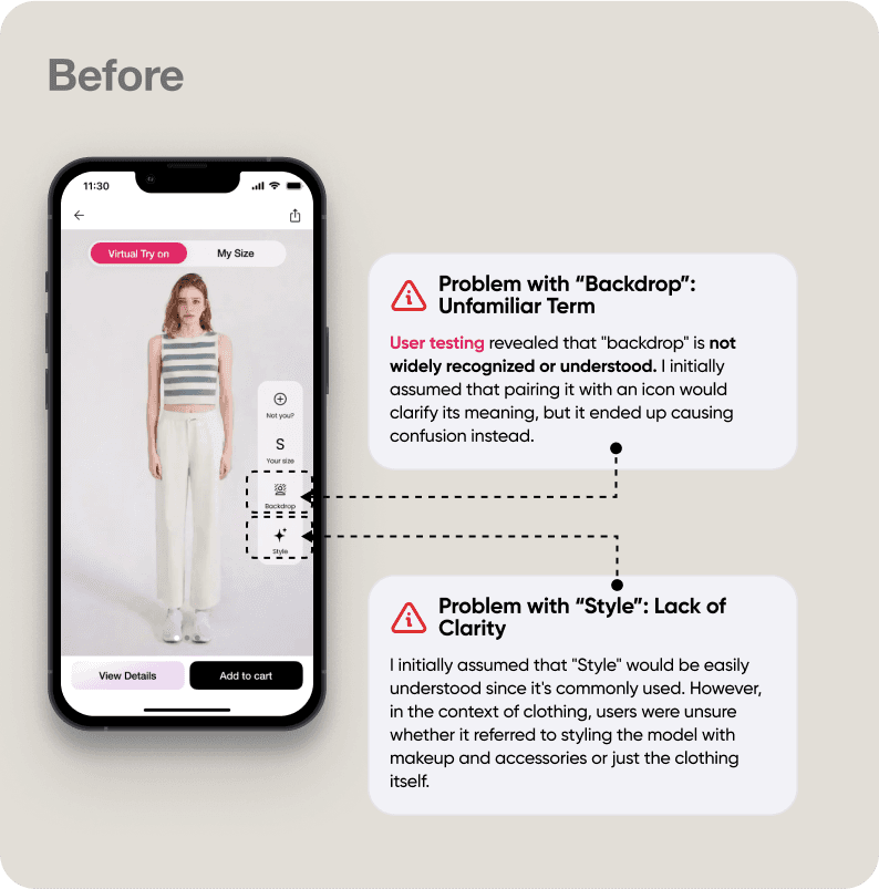 Through testing, I realized AR try-on had major usability challenges, especially on personal devices. It worked better on larger screens, but users struggled with clothing quality, patterns, and model distortions when viewing up close.