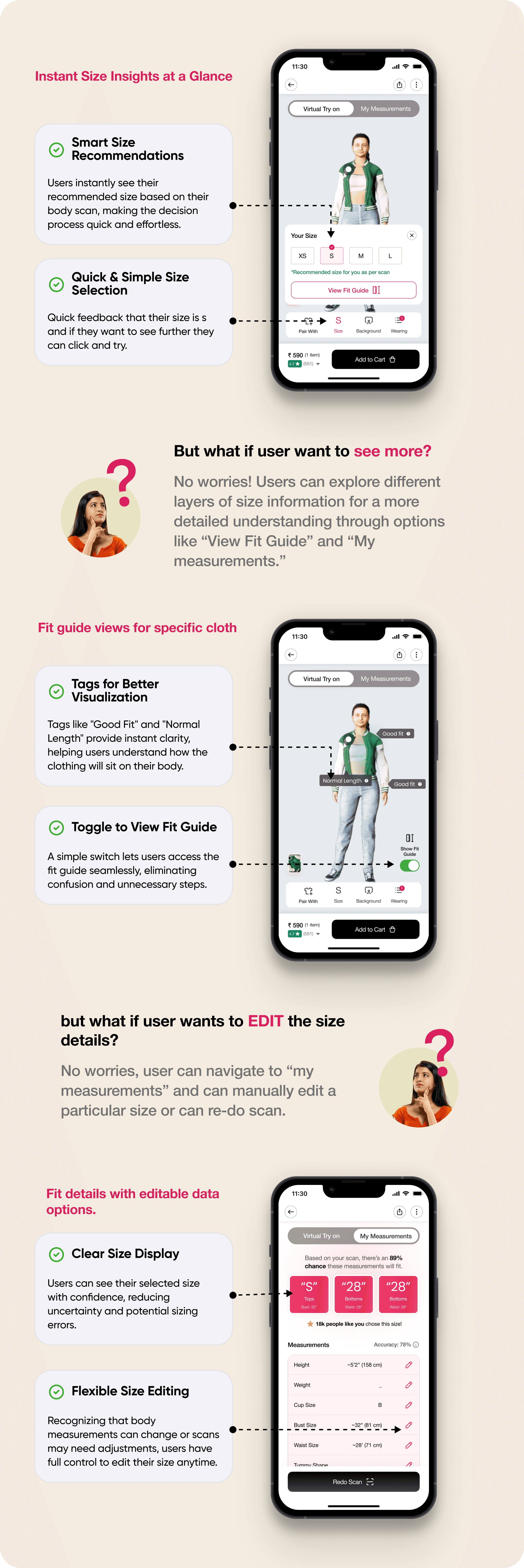 Those who are serious about sizing should have the option to view detailed measurements, while those who prefer a quick selection should not feel overwhelmed. Additionally, users more focused on appearance should have the flexibility to skip size details altogether.