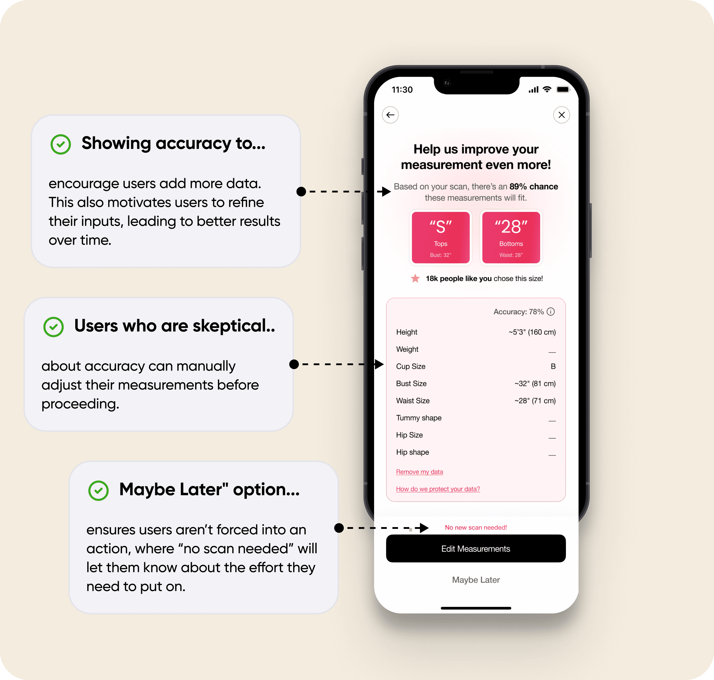 Users don’t want to put extra effort into measuring themselves, and there’s no proper guidance or encouragement, leading to dissatisfaction with sizing.